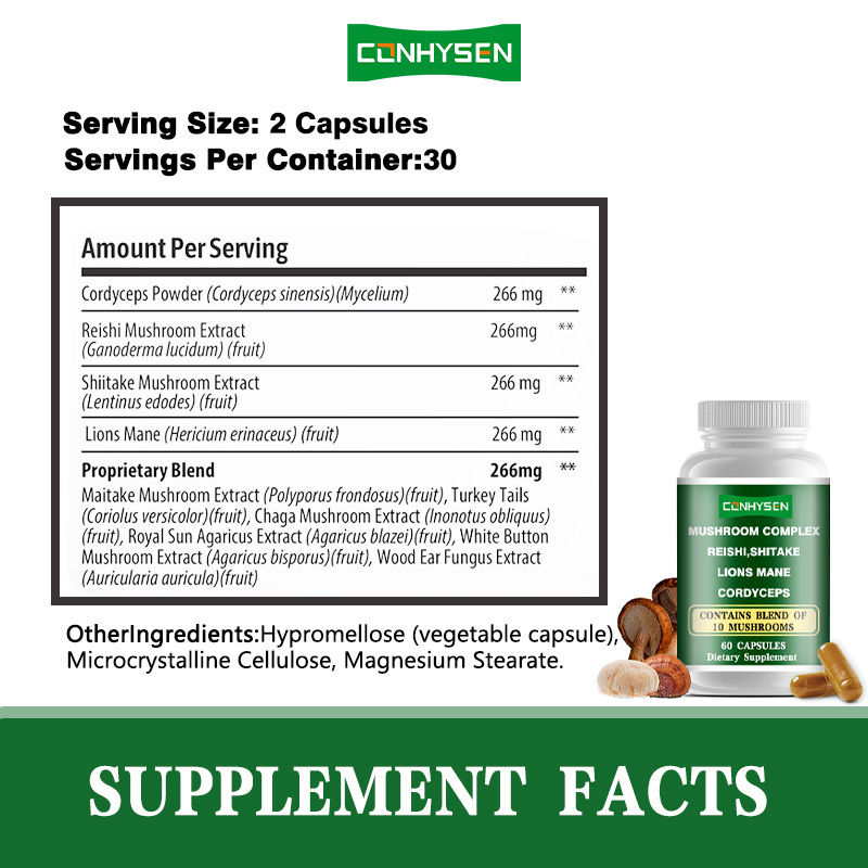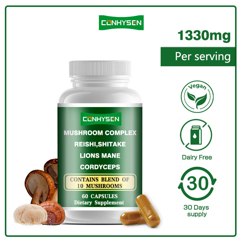 As cápsulas de complexo de cogumelos são um suplemento dietético que é cientificamente formulado e refinado a partir de vários cogumelos funcionais, como Reishi, Shiitake, micelio Lingzhi e Tremella.Incorpora os preciosos ingredientes ativos como polissacarídeos, terpenoides, ergotioneína e minerais destes cogumelos, atuando como um repositório natural de saúde que proporciona proteção multidimensional da saúde do corpo humano.