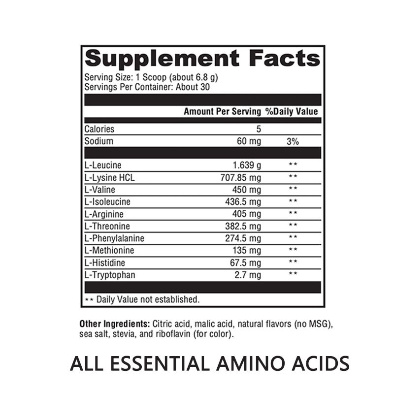 L-Leucina, L-Isoleucina, L-Valina, L-Lisina HCL, L-Arginina, L-Treonina, L-Fenilalanina, L-Metionina, L-Histidina, L-Triptofano