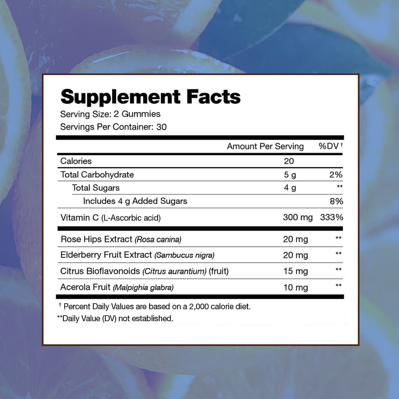 Vitamina C, Extrato de Rosa Mosqueta, Extrato de Fruta de Sabugueiro, Bioflavonoides Cítricos, Fruta de Acerola