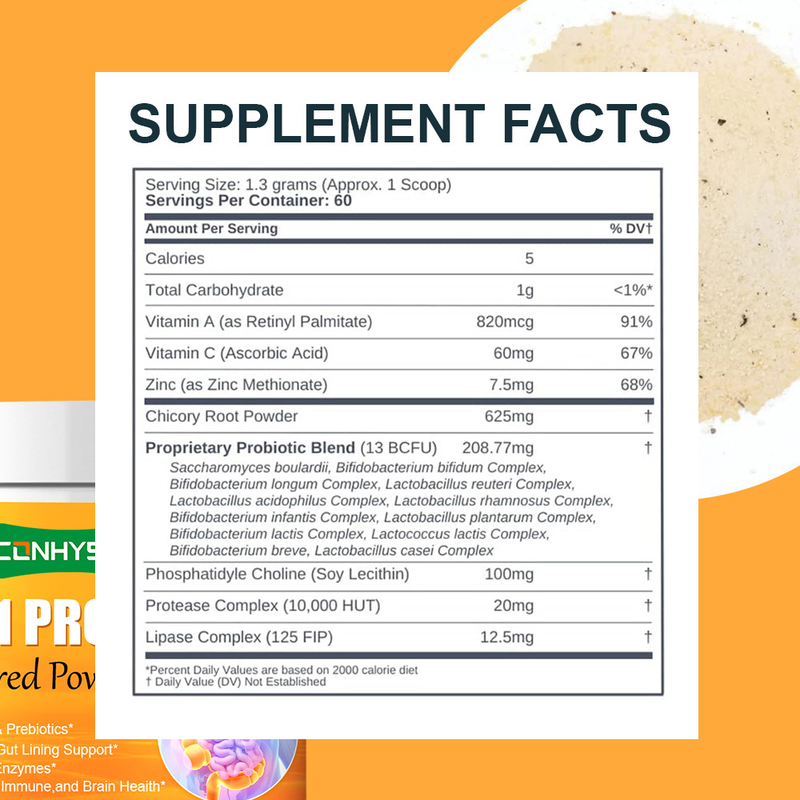 Vitamina A, Vitamina C, Zinco, Pó de raiz de chicória, Mistura Probiótica Proprietária, Fosfatidilcolina, Complexo de Proteases, Complexo de Lipases