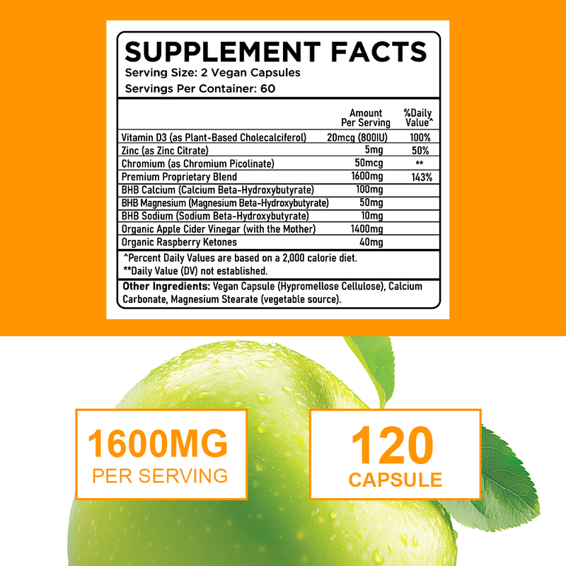 Vinagre de Maçã Orgânico, Vitamina D3, Zinco, Cromo, Mistura Proprietária Premium, BHB Cálcio, BHB Magnésio, BHB Sódio, Cetona de Framboesa Orgânica