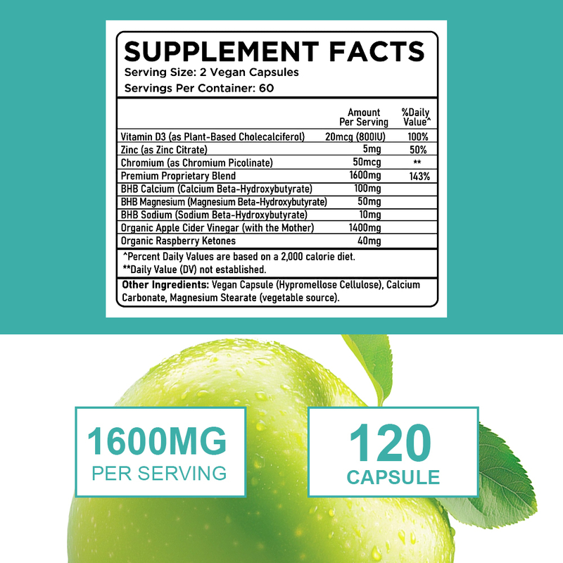 Vinagre de maçã orgânico, vitamina D3, zinco, cromo, mistura exclusiva premium, BHB cálcio, BHB magnésio, BHB sódio, cetonas orgânicas de framboesa