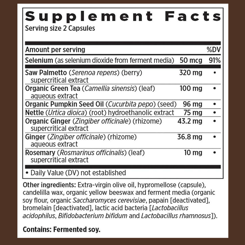 Selênio, Saw Palmetto, Chá Verde Orgânico, Óleo de Sementes de Abóbora Orgânica, Urtiga, Gengibre Orgânico, Gengibre, Romário